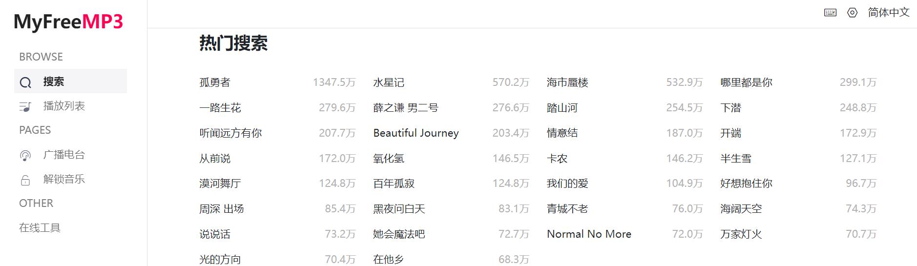 MyFreeMP3是一款资源极度丰富,功能较全的音乐网站。它的特点,就是无广告且免费,支持畅听和下载,适合喜欢听音乐的小伙伴食用。