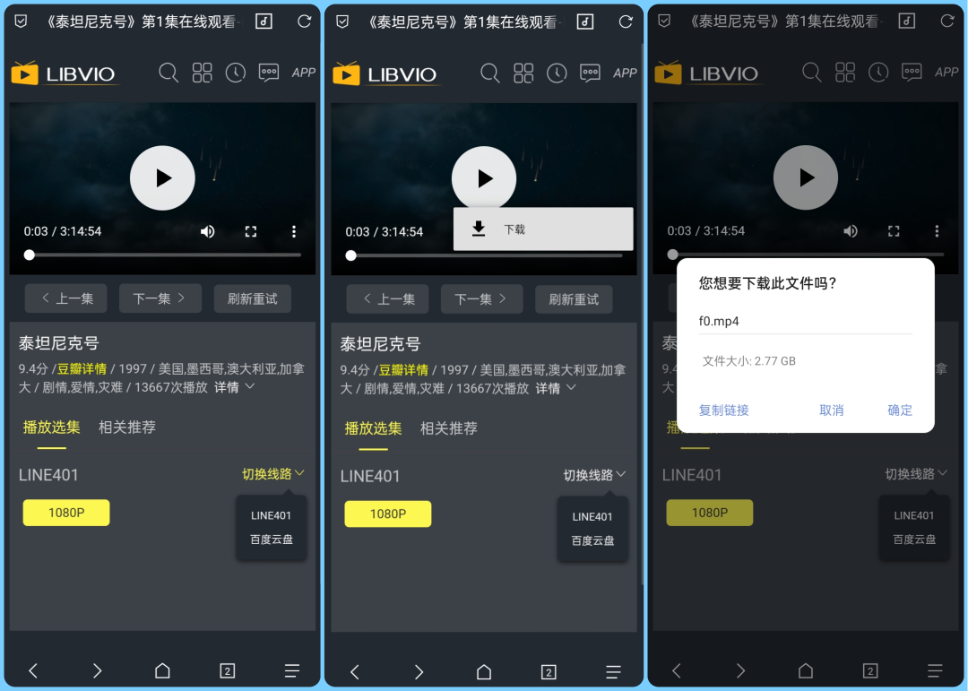 【LIBVIO】在线播放速度也超快,极速加载基本不会出现卡顿现象,网站虽然也是个在线播放为主的影视站,但是站长还贴心的提供了度盘和阿里网盘的链接,方便一下需要下载或者剪辑的朋友使用,同时也支持本地离线下载,无需安装任何下载工具;