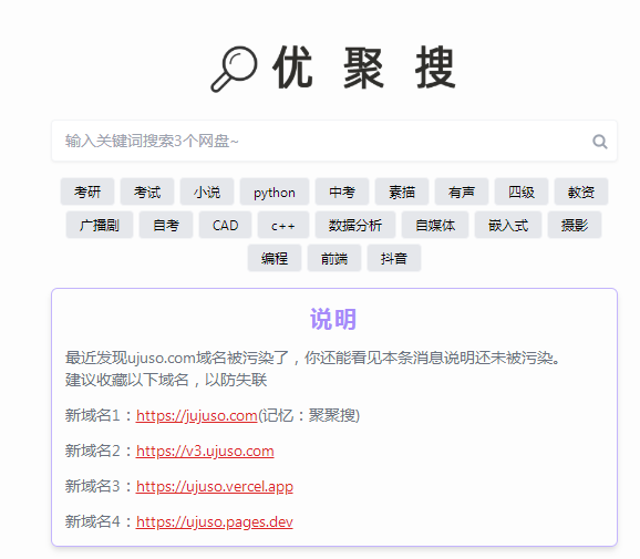 这是一个比较新的网盘搜索引擎,虽然网络上存在很多类似引擎,但都有各种限制,比如关注公众号才能下载,体验极差,而优聚搜目前没有任何限制,体验还是非常不错的。