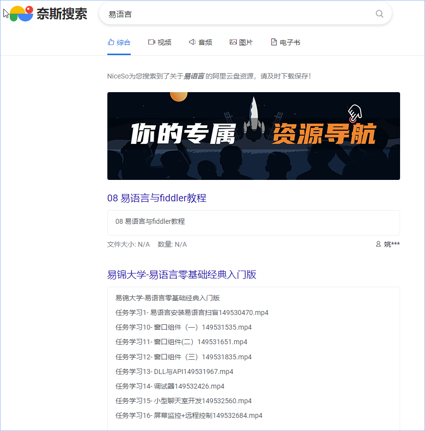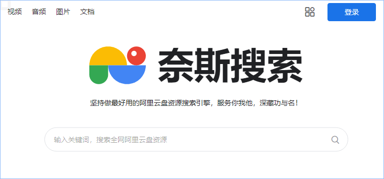 奈斯搜索是一款阿里云盘资源搜索引擎。网站界面简洁而且完全免费无门槛使用,提供有视频、音频、图片、文档和电子书等多种类型资源的检索