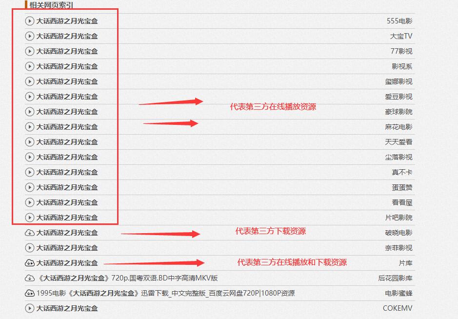 电影狗不单单抓取了在线电影观看,还抓取了电影资源下载的链接,如下图:
