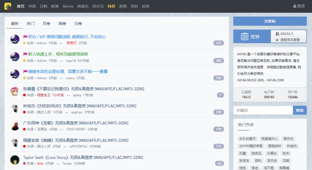 身为一名音乐发烧友,好的耳机,好的前端设备都受限于音乐的音质。HiFiNi音乐磁场的宗旨是建立一个由音乐爱好者维护的分享平台。上面可以下载大多数热门音乐的无损版本。