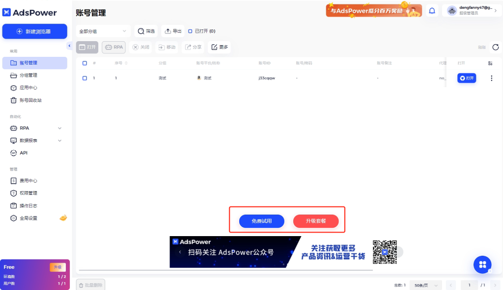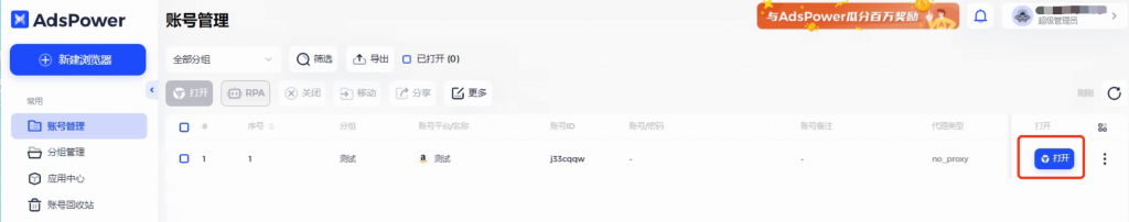 1、账号管理,显示新建的浏览器环境,点击打开,启动浏览器环境