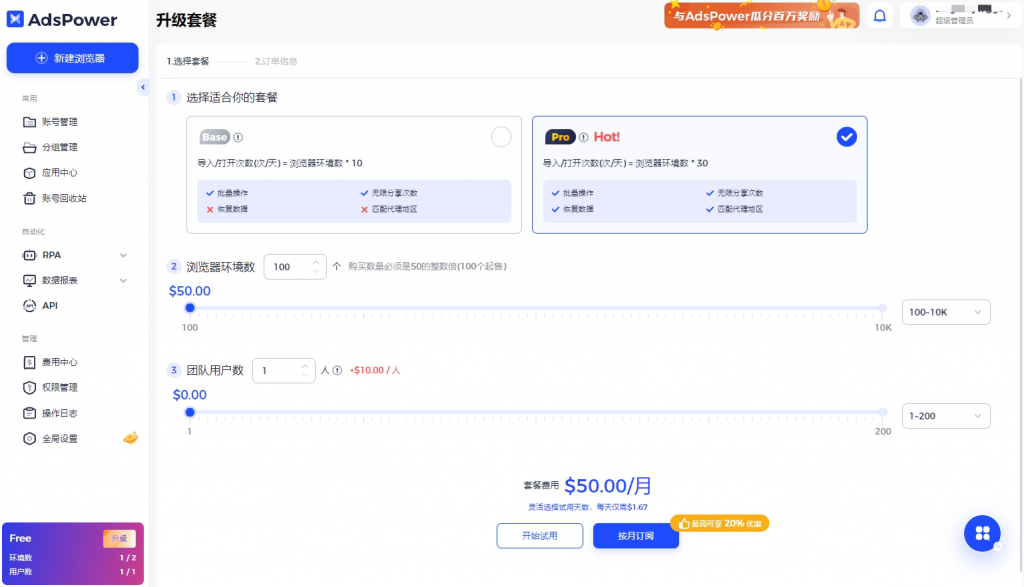 1、选择是适合您的套餐或领取3天免费试用(Base/Pro)