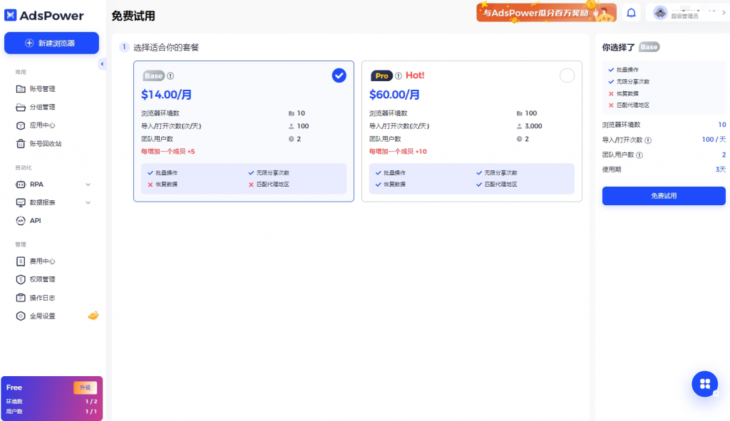 Base:不支持恢复数据,不支持匹配代理地区,每天打开/导入限制=浏览器环境数*10