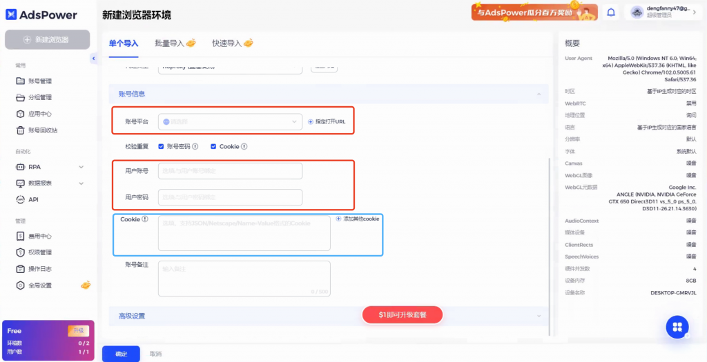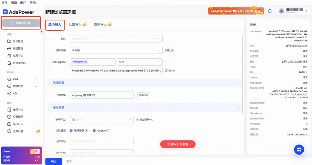 新建浏览器:账号管理->“+新建浏览器”->“单个导入”