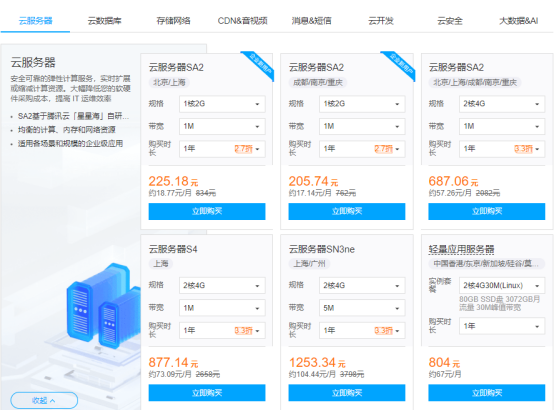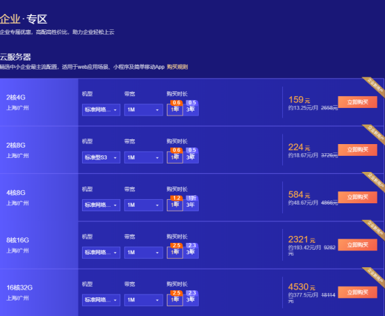 下面列举的是企业新用户专享方案,只适合企业认证的新用户参与购买,价格、配置个人觉得均非常合理,是中小企业最主流配置,适用于web应用场景、小程序及简单移动App等。均为KVM架构,购买后可以随时升级配置,支持Windows、Linux系统。