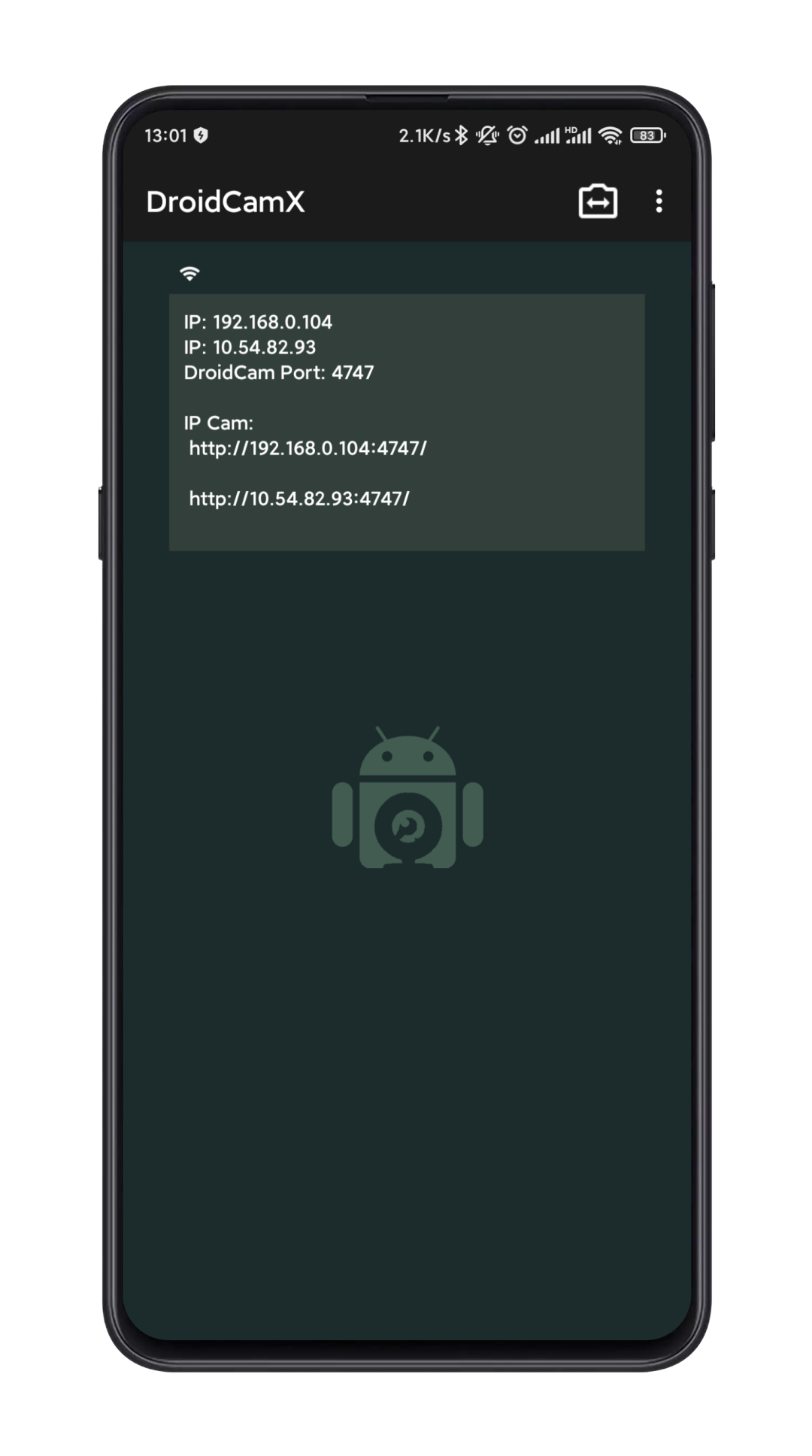 接下来在 手机上 安装 客户端 应用,打开后即可见 下方图示 的 连接信息,点击 右上角 的 切换图标 可 选择摄像头 进行使用。点击 右上角 的 菜单 – 设置 后可见 保持设备处于换新状态、屏幕自动变暗、DroidCam Port、摄像头、麦克风、IP网络摄像头 等功能。