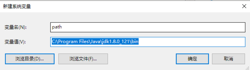 点击新建,变量名:path,变量值:刚刚JDK的安装路径,例如我的:C:\Program Files\Java\jdk1.8.0_121\bin。