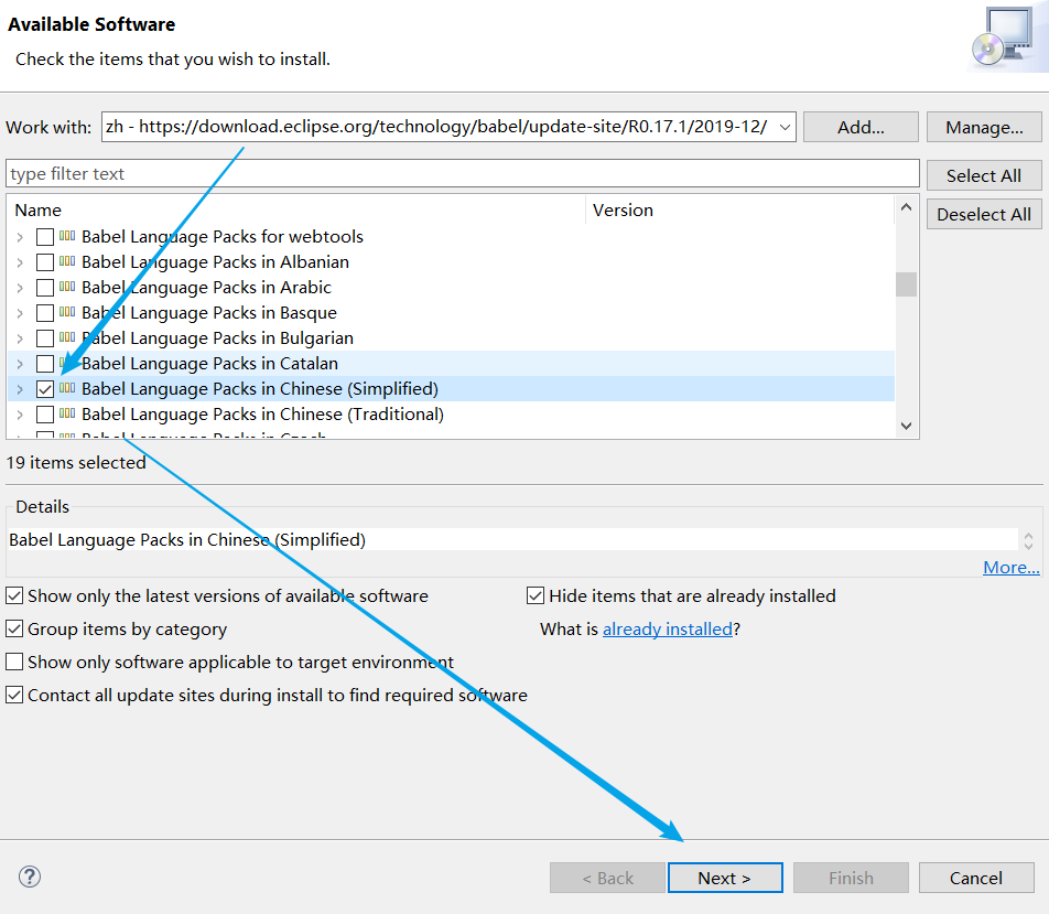 2019年6月版:https://download.eclipse.org/technology/babel/update-site/R0.17.1/2019-06/