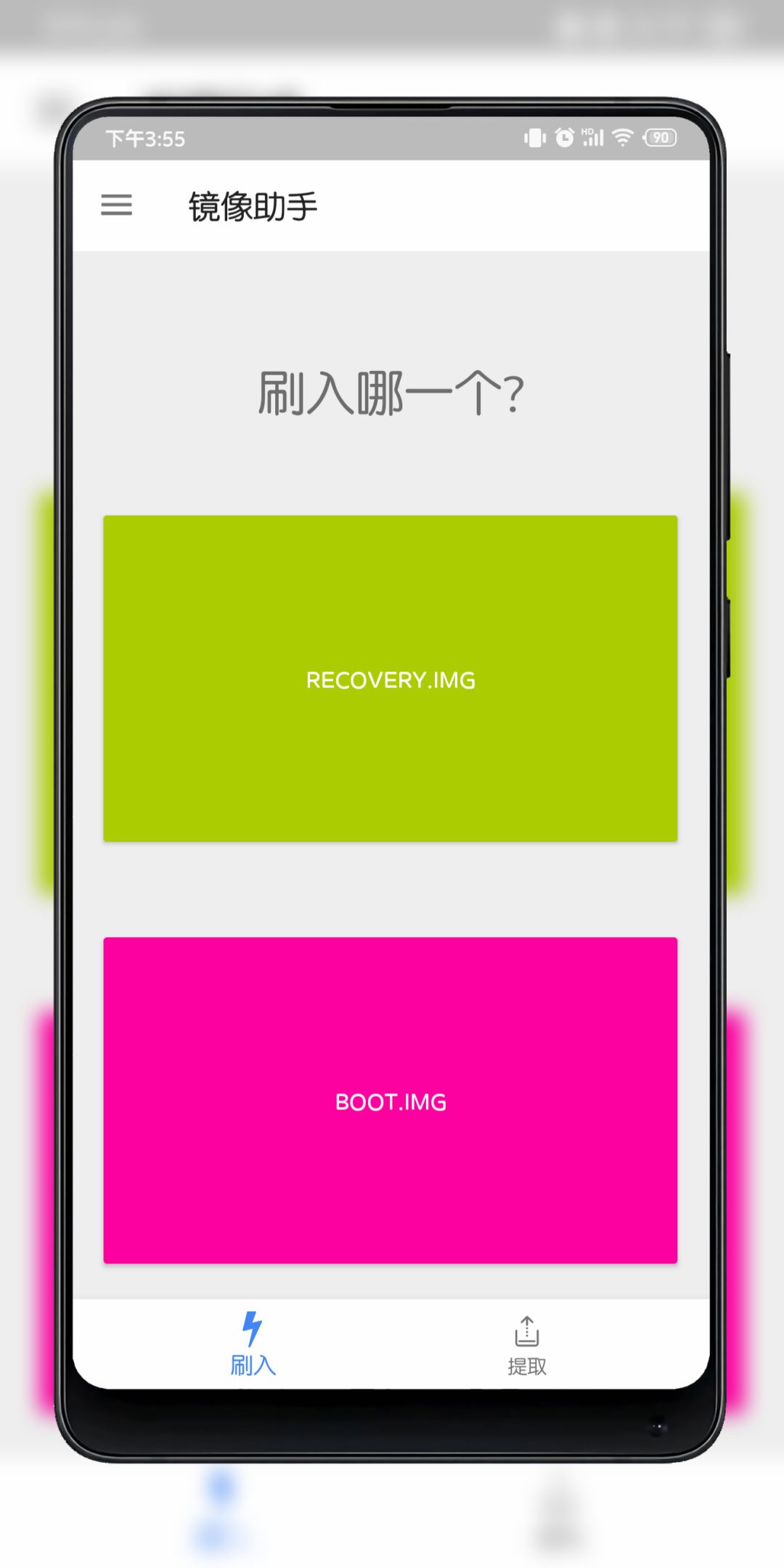 下载一个支持自动解密data的*、对应机型的REC*刷机包(.img)后,使用 镜像助手 (App)* 并授权Root权限 。点击 RECOVERY.IMG 然后选择下载好的REC刷机包(.img),刷入。