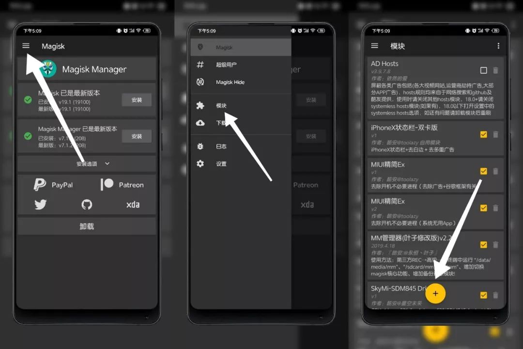 进入 Magisk Manager (App) ,依次点击左上角 → 模块 → “加号”,然后选择附件里提供下载的 MM管理器(叶子修改版)v2.2.zip (由酷安@永恒丶叶子 制作)。
