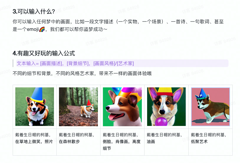 文本输入= [画面描述],[背景细节],[画面风格]/[艺术家] 进阶文本输入=[形容词+主体/主体+状语],[细节/背景],[画面类型],[选择风格/艺术家],[灯光/色调],[视角/修饰词] 氛围色调:阴郁心情、霓虹、鲜艳色彩。。。 视角:肖像、背景虚化、对称。。。 。。。。。。