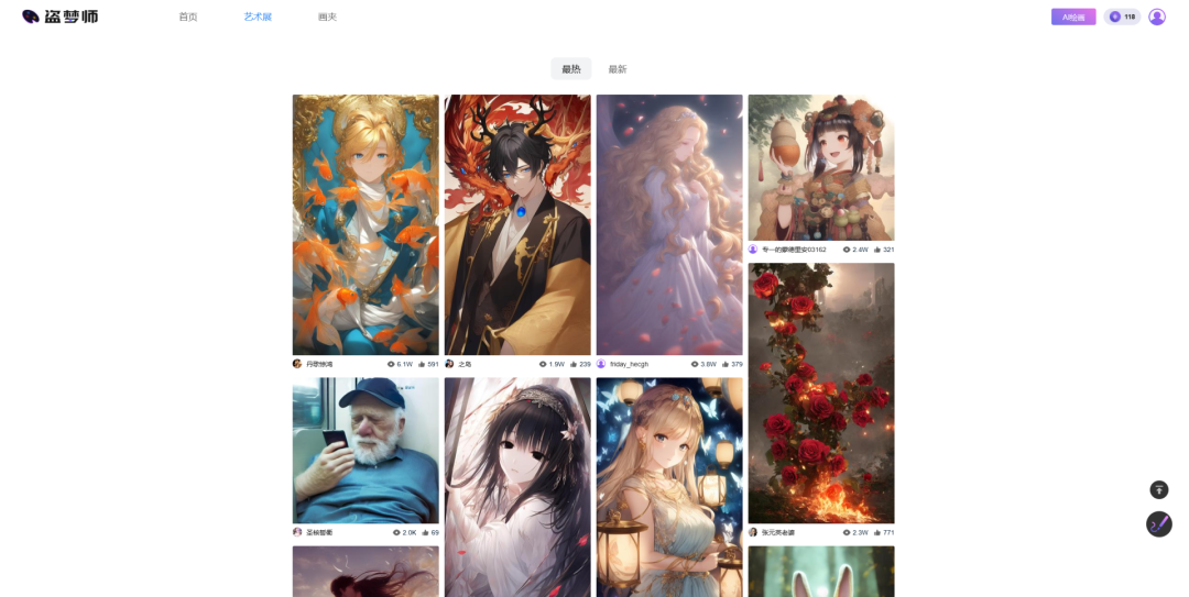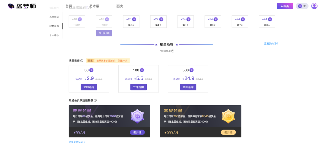 在此平台生成画作,需要付盗梦星。目前平台会每天送用户一些盗梦星,选择一次性生成多张图,会比较划算。如果不够,就需充值购买。目前商业模式和文心一格是一样的。