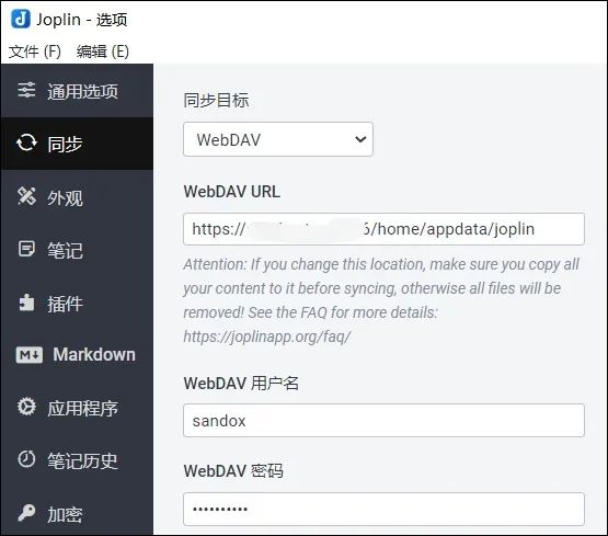 我的Joplin,使用WebDav的同步方式,直接同步到我家里的NAS服务器上。