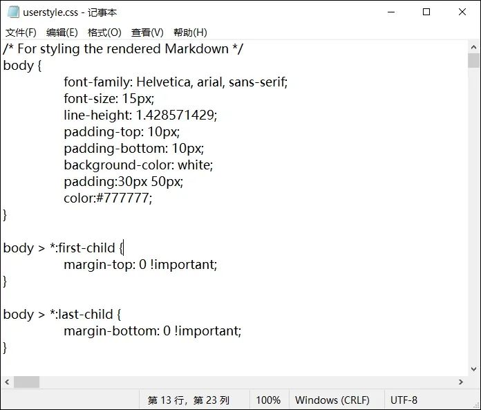 然后,Joplin会自动打开一个文本文档,这时,把之前在百度网盘下载到的“Pomonote.css”文件的内容全部复制粘贴进去,如下图: