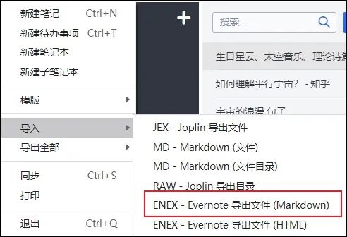 点击Joplin菜单中的“文件、导入”,然后再点击截图中的项目: