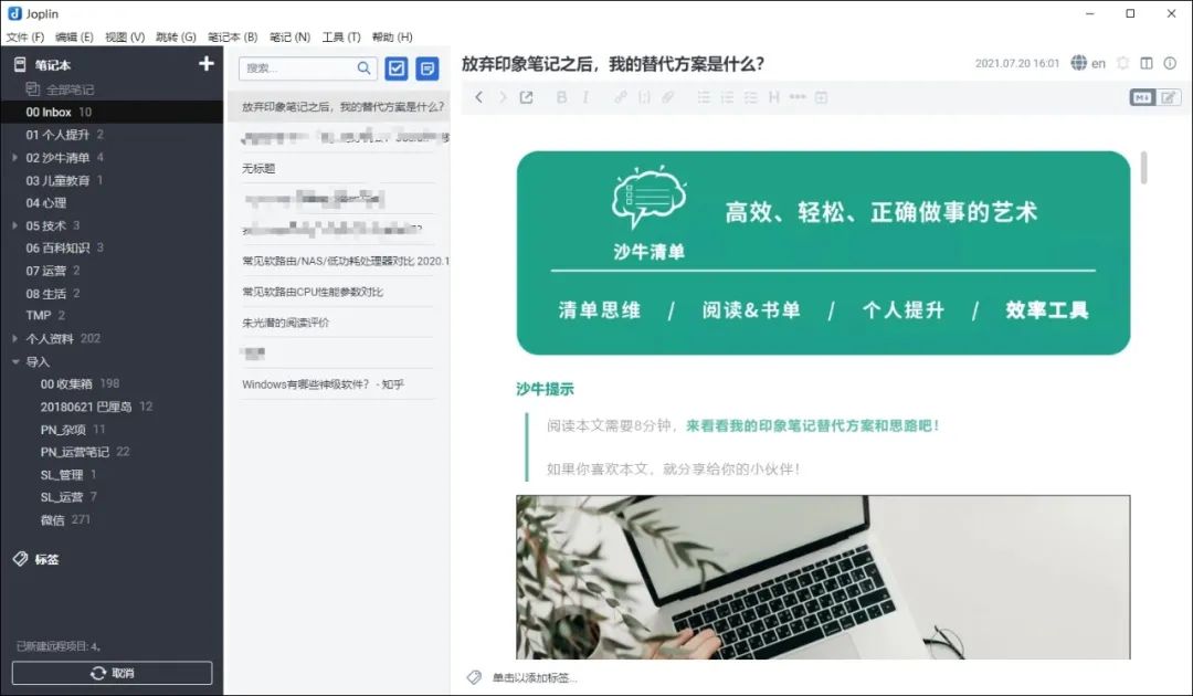 我使用Joplin已经有一个多月的时间,这段时间里,无论是记笔记,还是同步,都没有遇到任何的问题,连软件崩溃都没有出现过,而在我导出印象笔记数据的时候,印象笔记崩溃了四次。