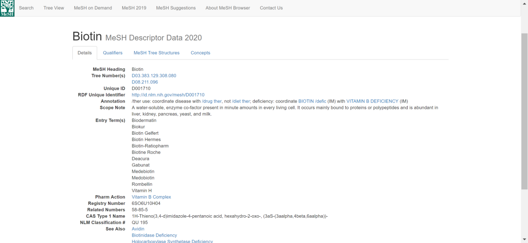 比如我们继续以「vitamin H」搜索,就会出现下方图片的检索结果,发现它的规范主题词是「Biotin」。