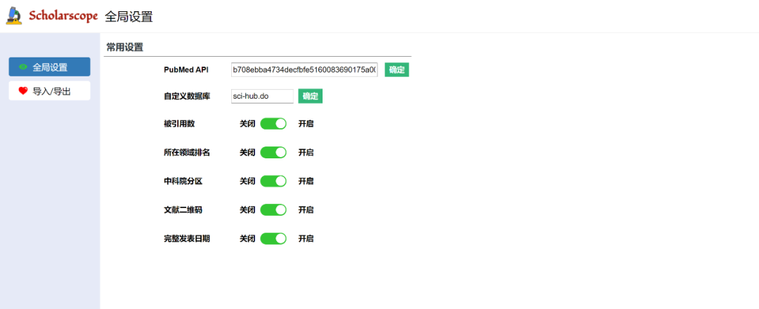 (1) 点击Scholarscope中的全局设置,将被引用数、所在区域排名等全部开启。这些设置完成可以实现前面介绍的功能1、3、4、5
