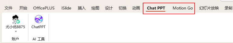 你还可以点击【下载ChatPPT插件】并安装,安装完成后,打开PowerPoint,即可在页面上方看到ChatPPT的选项,同时还会有一个Motion Go(该选项主要是提供动画设置、文字云、配音等功能)。